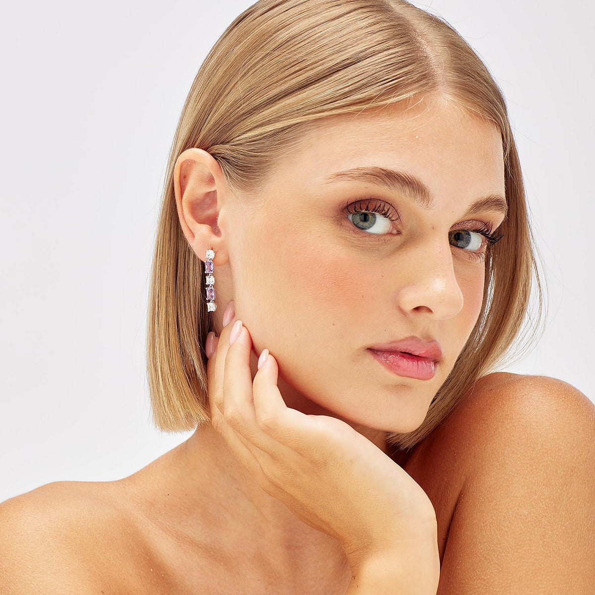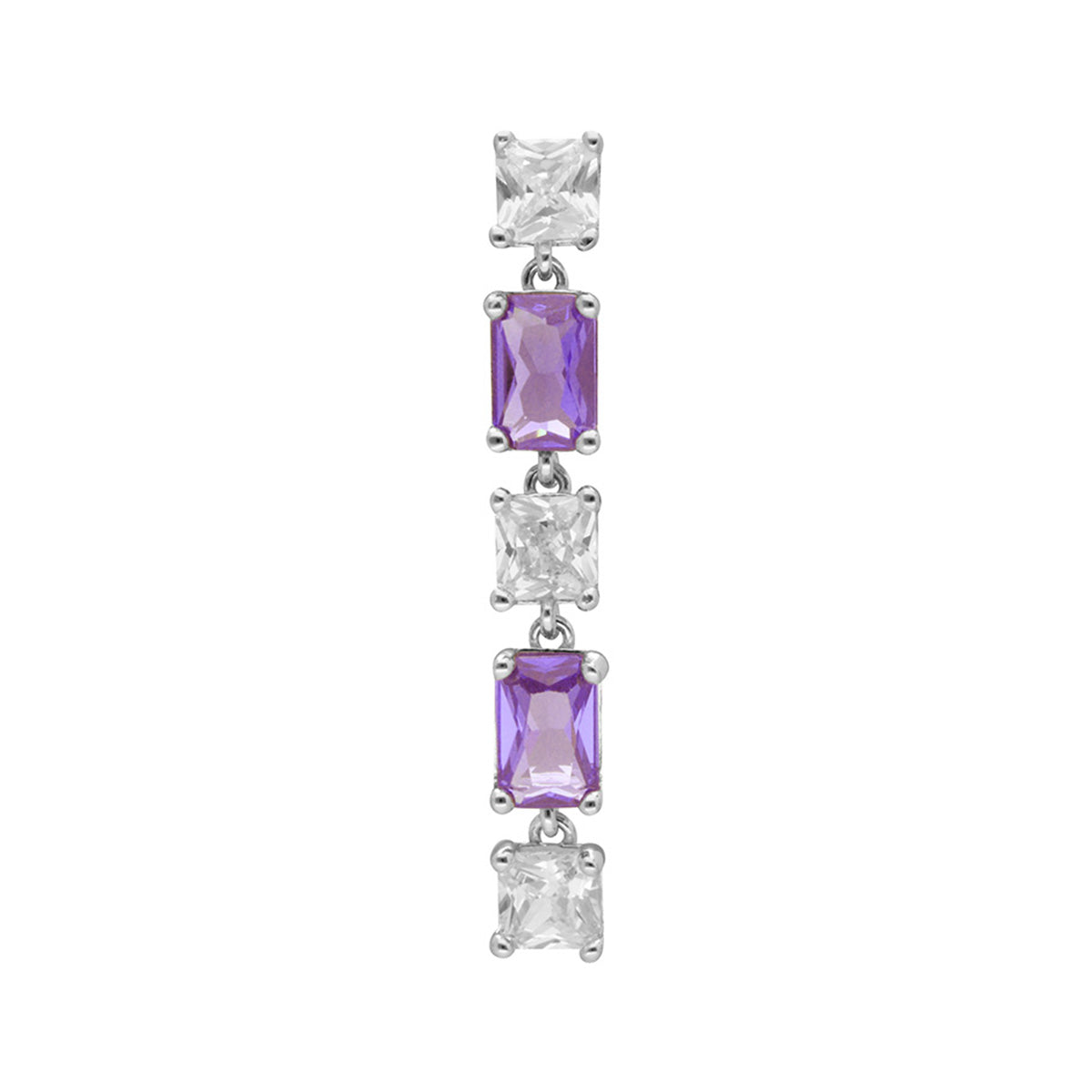 Arete individual colgante de plata de ley 925. con circonita cúbica y corte baguette color amatista.