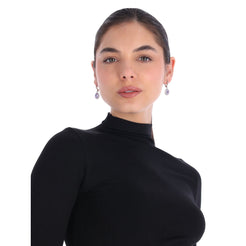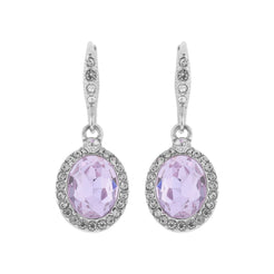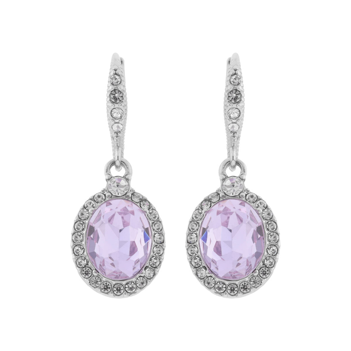 Aretes color plateado, givenchy, forma oval tipo colgante corto con incrustaciones de cristal en color violeta, cierre tipo gancho francés, familia royal shine, contenido 1 par de aretes