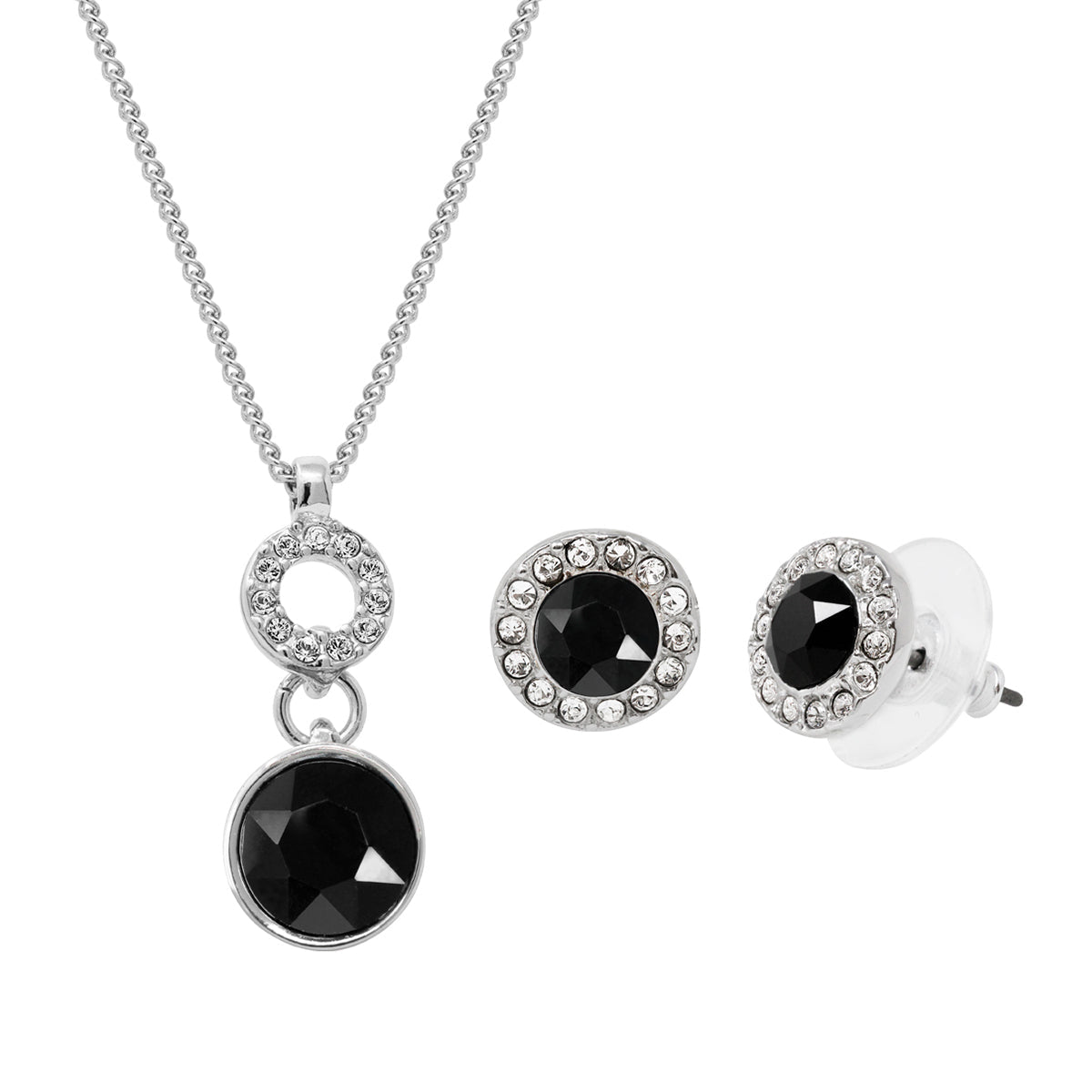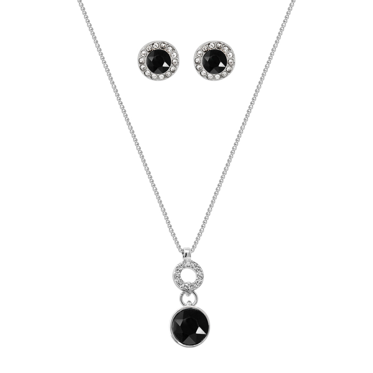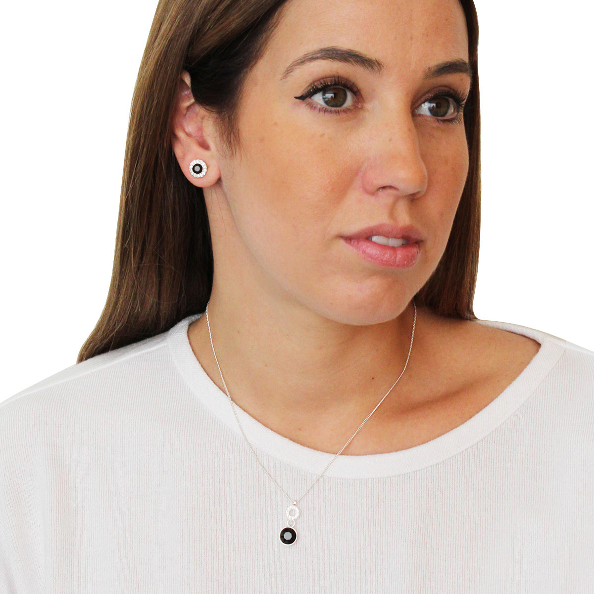 Set de collar con colgante y aretes tipo bot?n plateados en forma circular con detalles de cristal color negro