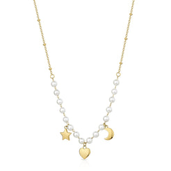 Collar de acero inoxidable 316l en color dorado y perlas de concha con colgantes en forma de luna, corazón y estrella.