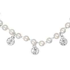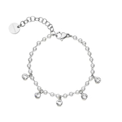 Brazalete de acero inoxidable 316l y perlas de concha con cristales colgantes color claro.